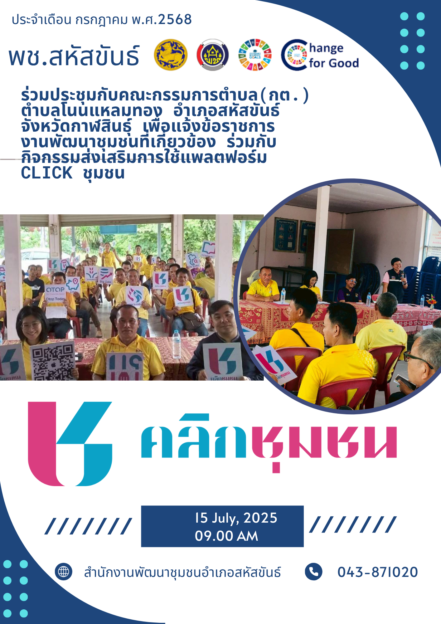 พช.สหัสขันธ์..ดำเนินกิจกรรมขับเคลื่อนการให้บริการหรือใช้ประโยชน์จากแพลตฟอร์มดิจิทัล “Click ชุมชน” ประจำเดือน กรกฎาคม 2568